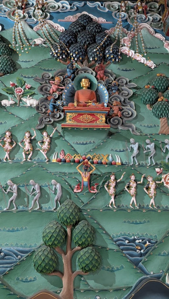 จากนั้นเรากระโดดขึ้นรถริกชอว์เพื่อไปที่วัดภูฏาน ซึ่งสำหรับผมเป็นหนึ่งในวัดที่ชอบที่สุดที่ได้ไปในวันนั้น เพราะบนผนังมีพุทธประวัติเป็น 3D ซึ่งผมไม่เคยเห็นที่วัดไหนมาก่อน