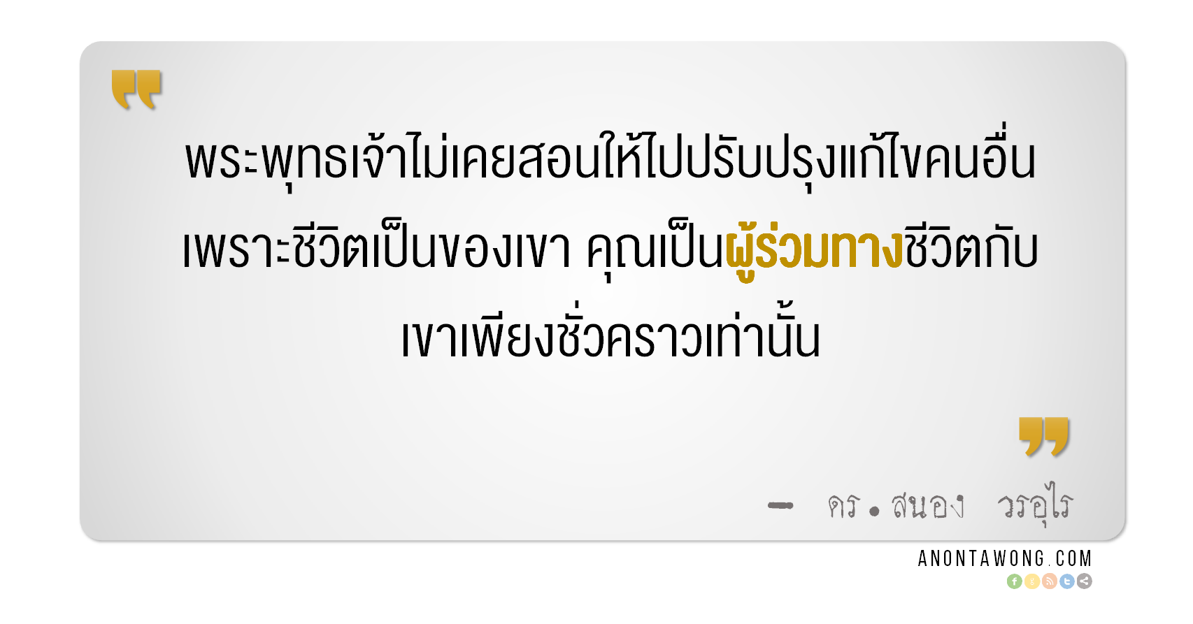“พระพุทธเจ้าไม่เคยสอนให้ไปปรับปรุงแก้ไขคนอื่น แต่ให้แก้ที่ตัวเอง เมื่อบอกแล้วเขายังไม่ศรัทธาก็ต้องปล่อยวาง เพราะชีวิตเป็นของเขา คุณเป็นผู้ร่วมทางชีวิตกับเขาเพียงชั่วคราวเท่านั้น”