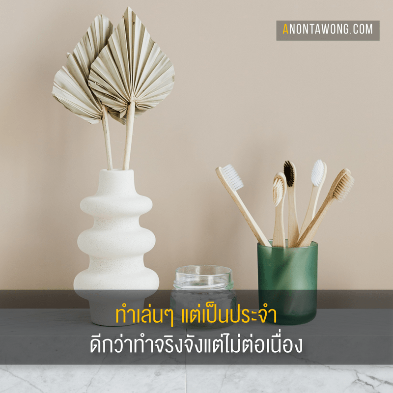 ตั้งเป้าหมายเล็กๆ ลองทำเล่นๆ แต่ทำมันทุกวัน แล้วความเคยชินจะส่งผล กิจวัตรจะทำให้เราทำได้โดยอัตโนมัติโดยไม่ต้องพยายาม แล้วผลตอบแทนทบต้นจะเป็นเพื่อนเรา