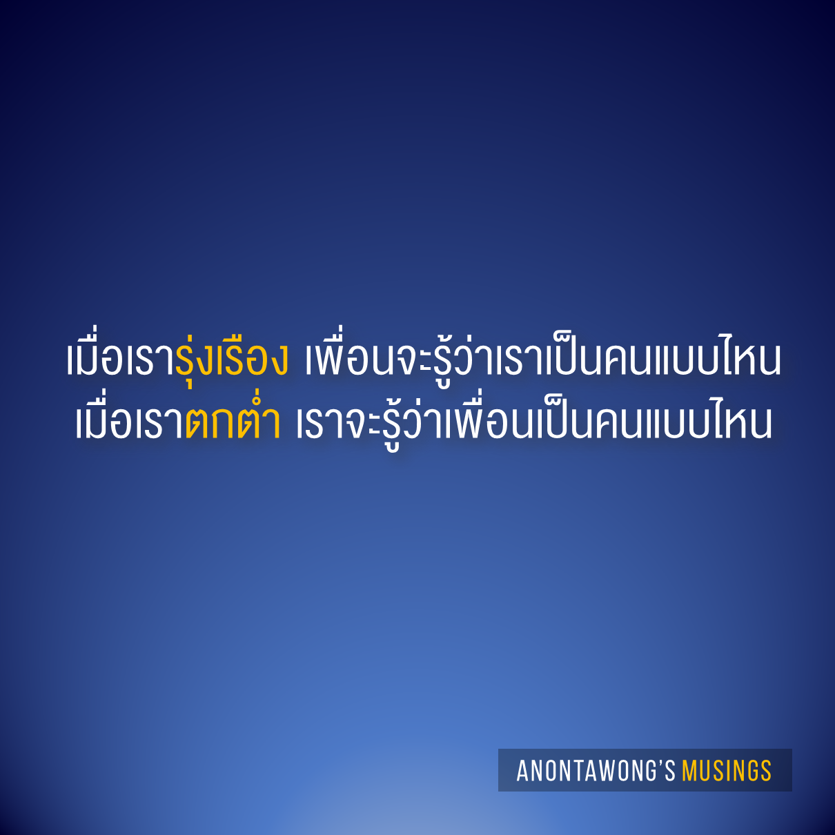 หากในช่วงที่เรารุ่งเรือง เราไม่ลืมตัว เรามีน้ำใจ เราไม่ดูถูก นั่นย่อมเป็นการดึงดูดคนที่ศีลเสมอกันให้เข้ามาอยู่ในวงจรชีวิต เมื่อถึงคราวที่ฟ้าฝนไม่เป็นใจ กัลยาณมิตรเหล่านี้ก็ยังพอจะเป็นที่ให้เราพักพิงได้
