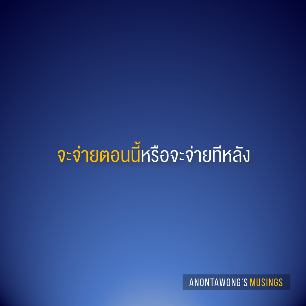 ผมเลยบอกกับผึ้งว่า ผมได้หัวข้อเขียนบล็อกแล้ว – “จะจ่ายตอนนี้หรือจะจ่ายทีหลัง”