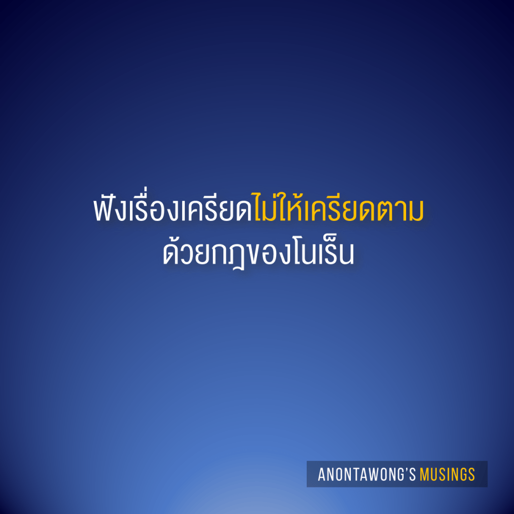 ดังนั้น เวลามีคนมาปรึกษาอะไร ให้เราจินตนาการว่าจิตใจของเราเป็นเหมือนผ้าโนเร็น ยิ้มน้อยๆ ทำใจสบายๆ อ่อนนุ่ม โล่งเบา ไม่เอาตัวเองลงไปคลุก