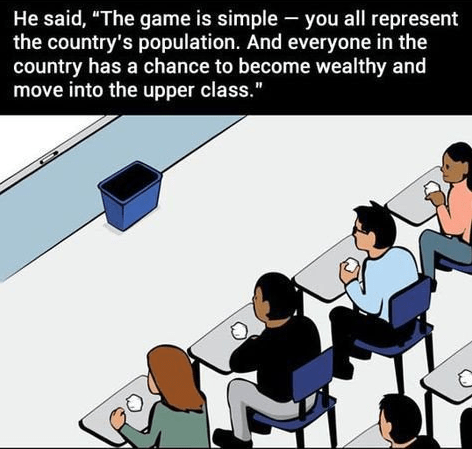 “เกมนี้ง่ายมาก พวกคุณคือตัวแทนของประชาชนในประเทศนี้ และทุกคนมีสิทธิ์ที่จะร่ำรวยและได้กลายเป็นชนชั้นบน (upper class) กติกามีเพียงอย่างเดียวคือคุณต้องโยนกระดาษให้ลงถังโดยห้ามลุกจากที่นั่ง”