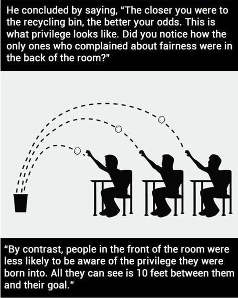“ยิ่งคุณอยู่ใกล้ถังเท่าไหร่ โอกาสสำเร็จของคุณก็ยิ่งมากขึ้น นี่แหละคือสิ่งที่เรียกว่าอภิสิทธิ์หรือข้อได้เปรียบ น่าคิดมั้ยว่า มีแต่คนที่นั่งอยู่หลังห้องเท่านั้นที่ทักท้วงเรื่องความแฟร์?