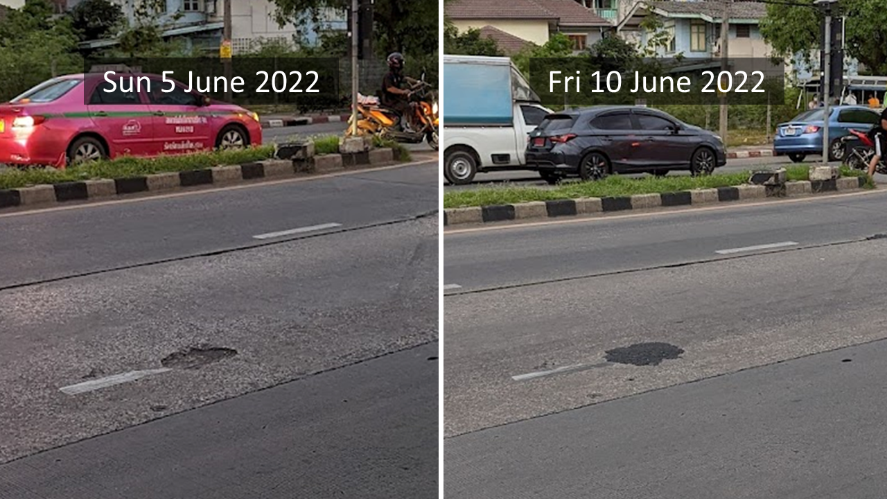 หลุมที่คุ้นเคยหายไปแล้ว มีแต่รอยยางมะตอยที่ราดเอาไว้