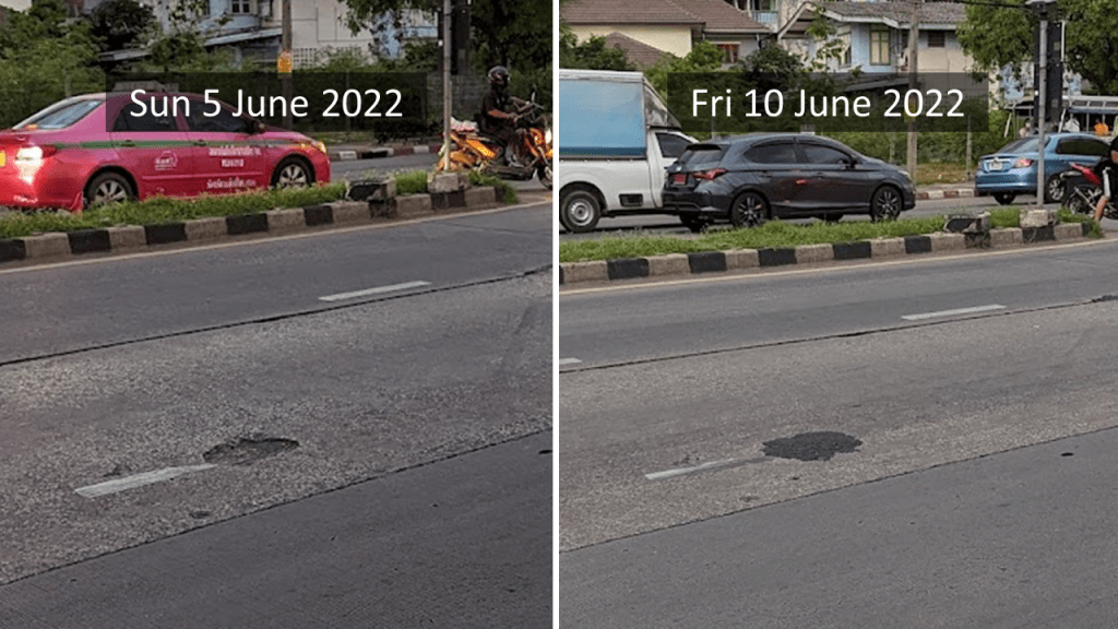 ช่วง 2 เดือนที่ผ่านมา ตรงจุดกลับรถนี้เริ่มมีหลุมบ่ออยู่กลางถนน เส้นผ่านศูนย์กลางประมาณ 20 เซนติเมตร ผมต้องพยายามขับรถหลบหรือขับคร่อมทุกครั้ง ในใจก็ได้แต่คิดว่าถ้ามอเตอร์ไซค์ที่ไม่คุ้นทางวิ่งมาเร็วๆ น่าจะอันตราย ยิ่งช่วงนี้เข้าหน้าฝนหลุมคงจะขยายใหญ่ขึ้นเรื่อยๆ