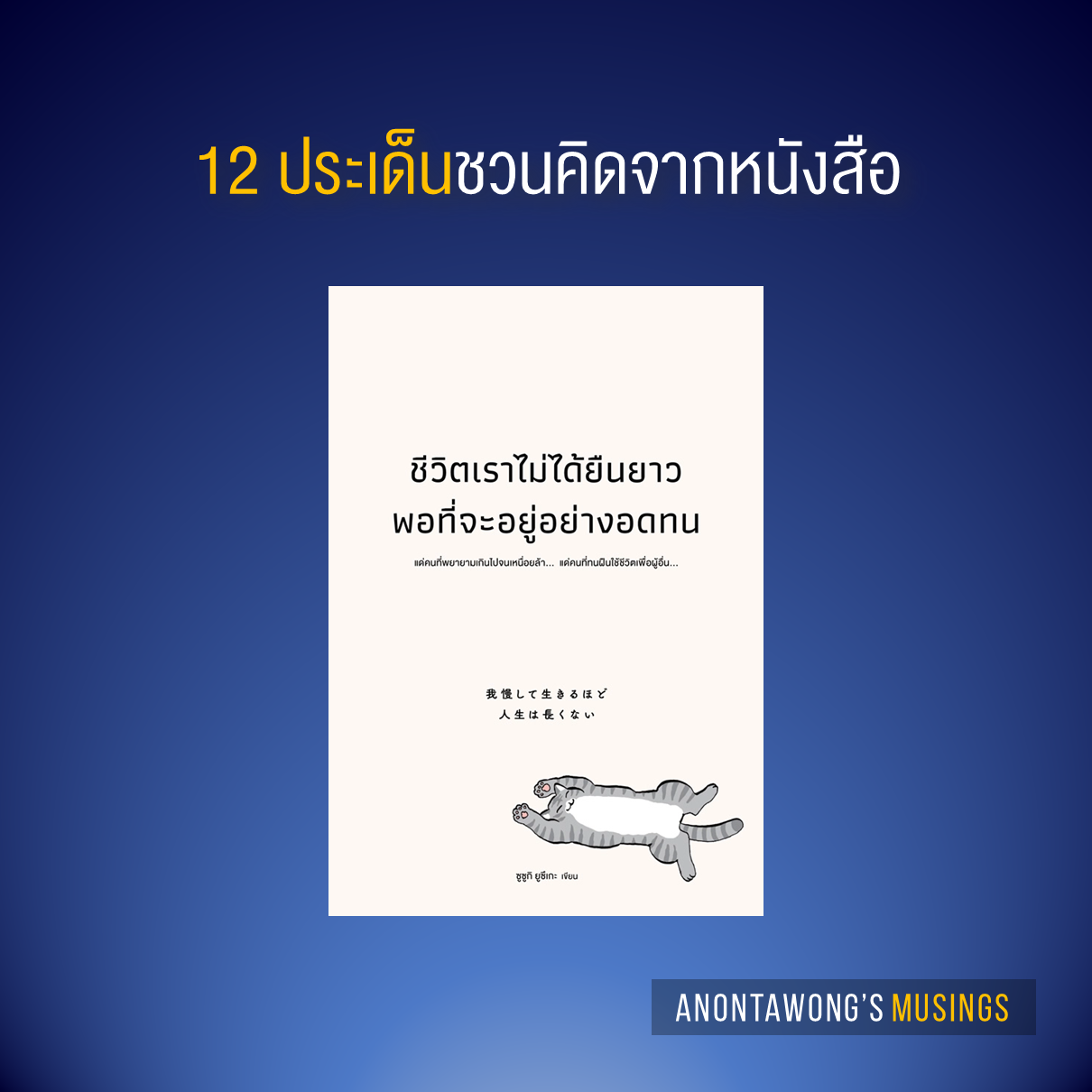 ขอบคุณเนื้อหาจากหนังสือ ชีวิตไม่ได้ยืนยาวพอจะอยู่อย่างอดทน ซูซูกิ ยูซึเกะ เขียน ชลฎา เจริญวิริยะกุล แปล สำนักพิมพ์วีเลิร์น