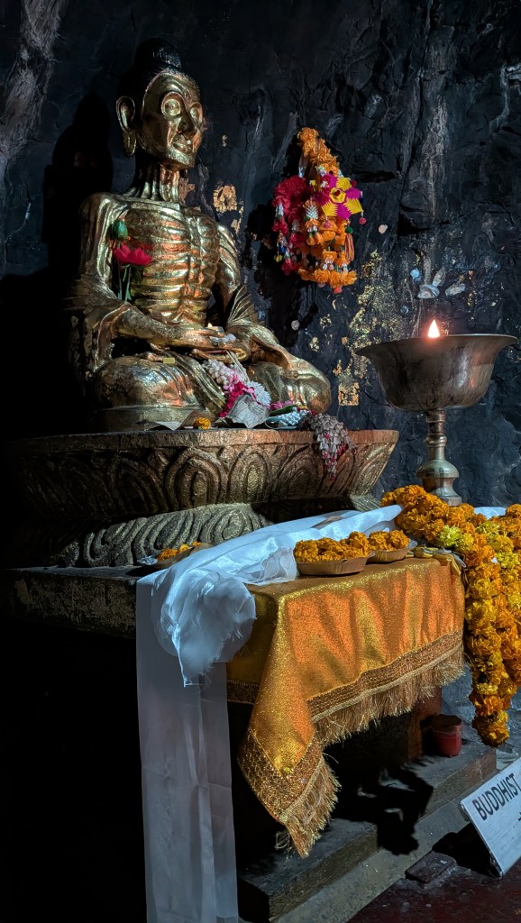 จุดที่เราเข้าไปไหว้เป็นถ้าเล็กๆ มี “พระพุทธรูป” ที่เป็นสมณะโคดมที่ร่างกายผ่ายผอมจนหนังหุ้มกระดูกนั่งสมาธิอยู่ ก่อนจะออกมาถ่ายรูปหมู่เป็นที่ระลึก