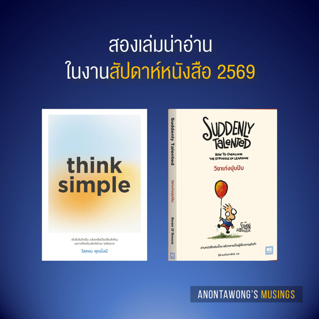 ในงานสัปดาห์หนังสือครั้งนี้ ผมจึงฝาก think simple และ Suddenly Talented จากสองมิตรสหายในบรรณพิภพไว้ในอ้อมอกอ้อมใจของทุกคนครับ