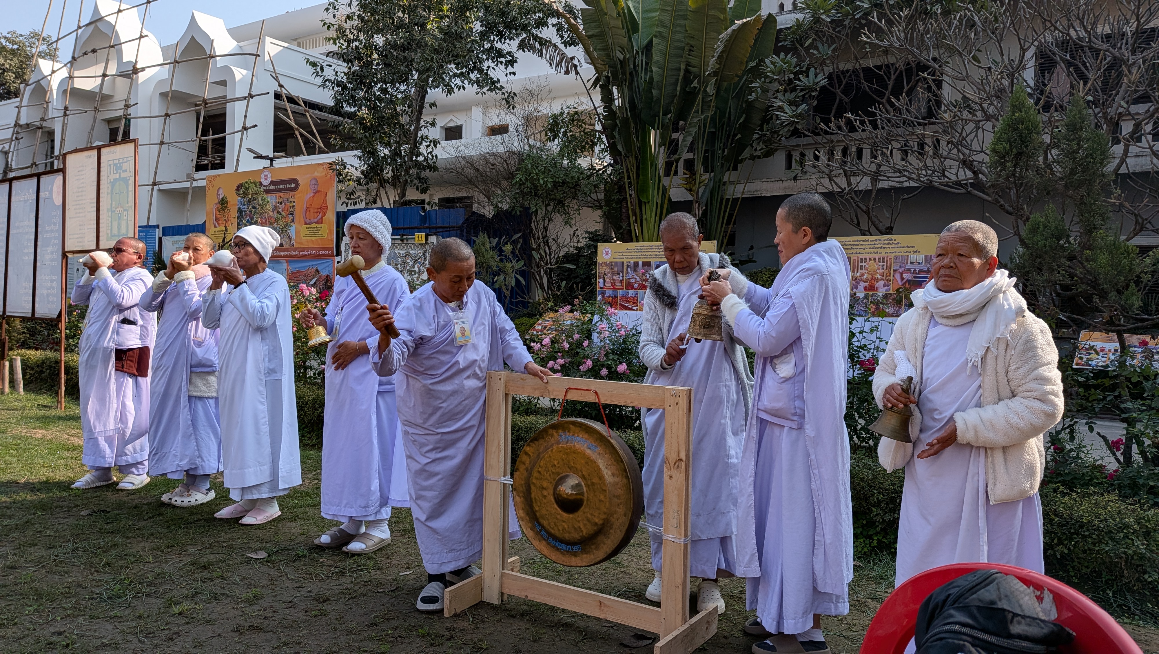 ในพิธียกช่อฟ้าที่คณะของเราไปร่วมด้วยนั้น มีแม่ชีมาตีฆ้อง เป่าสังข์ และเขย่าระฆังมือ ทำให้บรรยากาศดูขรึมขลังและประทับอยู่ในความทรงจำ พวกเราพนมมือถือสายสิญจน์มองเห็นช่อฟ้าที่ค่อยๆ ถูกรอกดึงขึ้นไปประดิษฐานบนยอดสุดของหลังคา