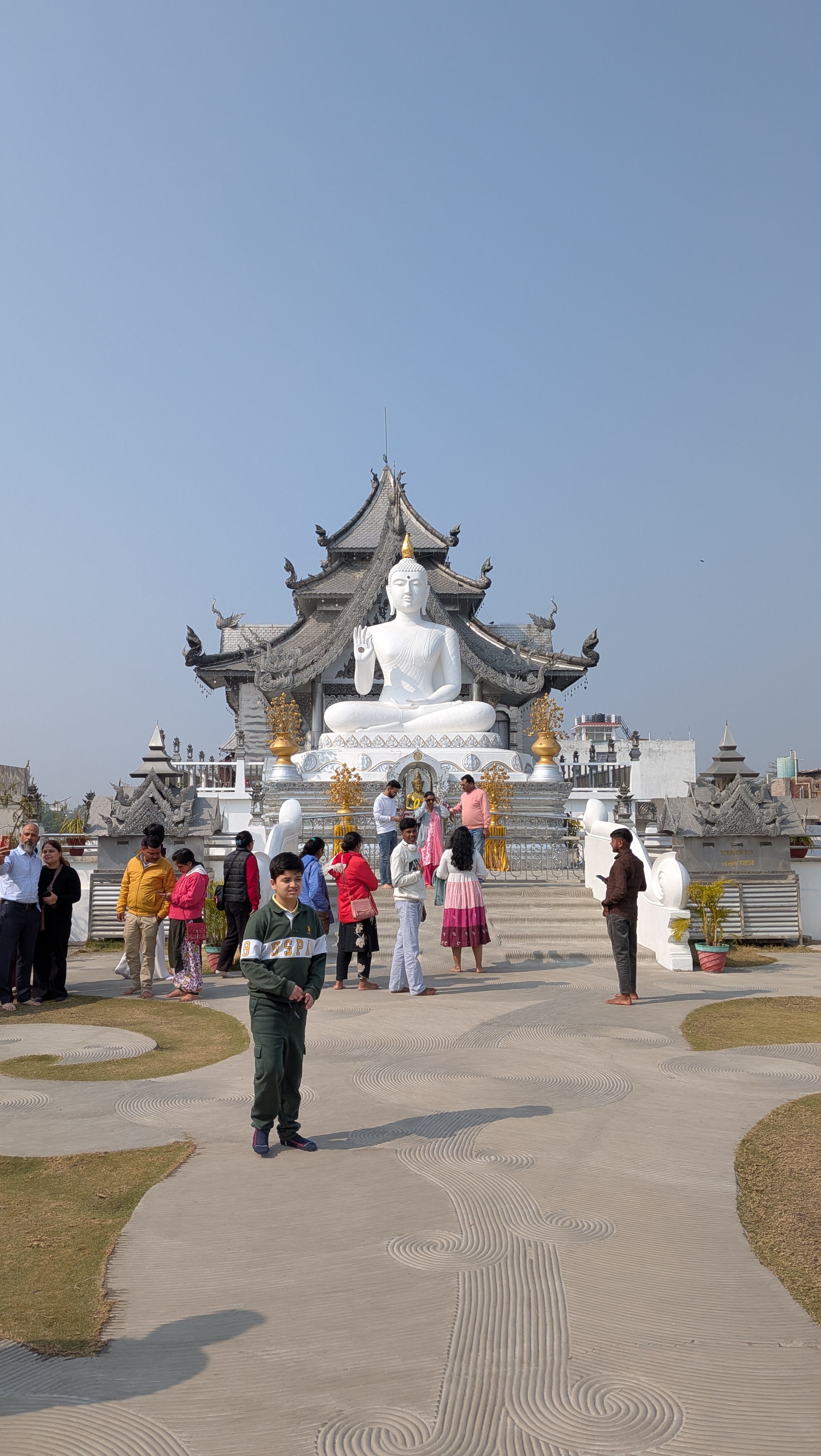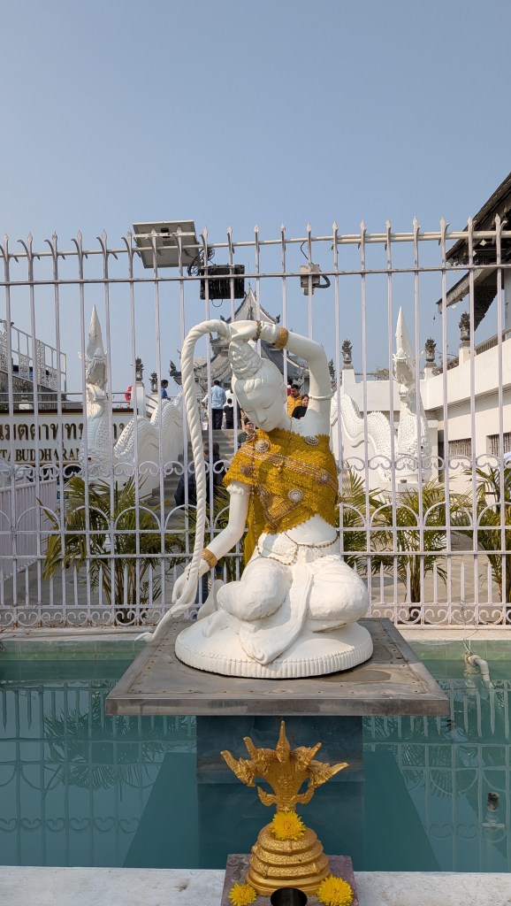 เราควรไปถึงสนามบินไม่เกินเที่ยง จึงยังพอมีเวลาแวะไหว้พระที่วัดเมตตาพุทธาราม ซึ่งเห็นปราดแรกก็ทำให้นึกถึงวัดร่องขุ่นของอาจารย์เฉลิมชัย เพราะมีพระประธานองค์สีขาว และด้านหน้าวัดก็มีแม่พระธรณีบีบมวยผมองค์สีขาวเช่นกัน ส่วนตัวอุโบสถนั้นสีเงินจนคนอินเดียเรียกวัดนี้ว่า Silver Temple