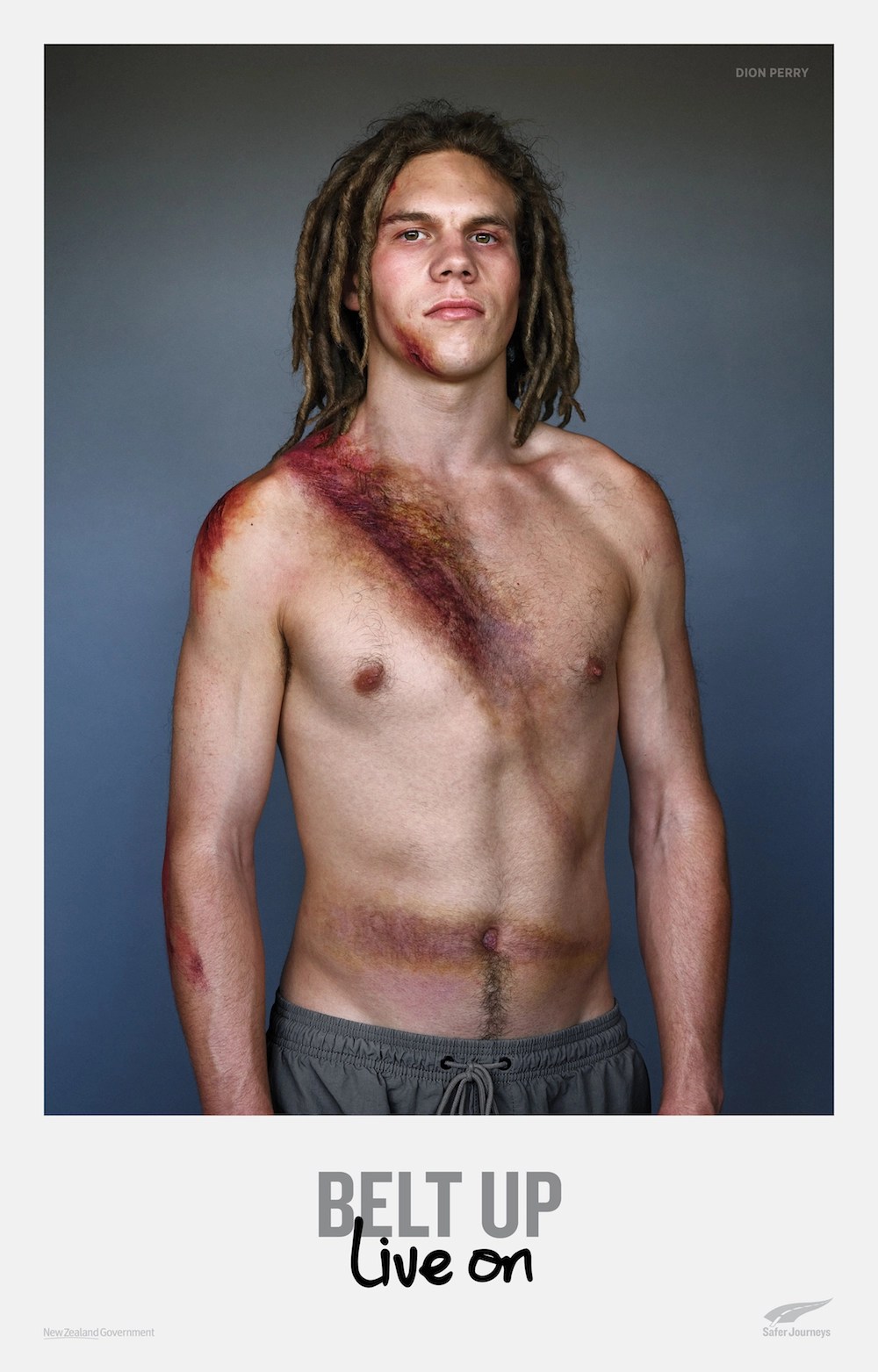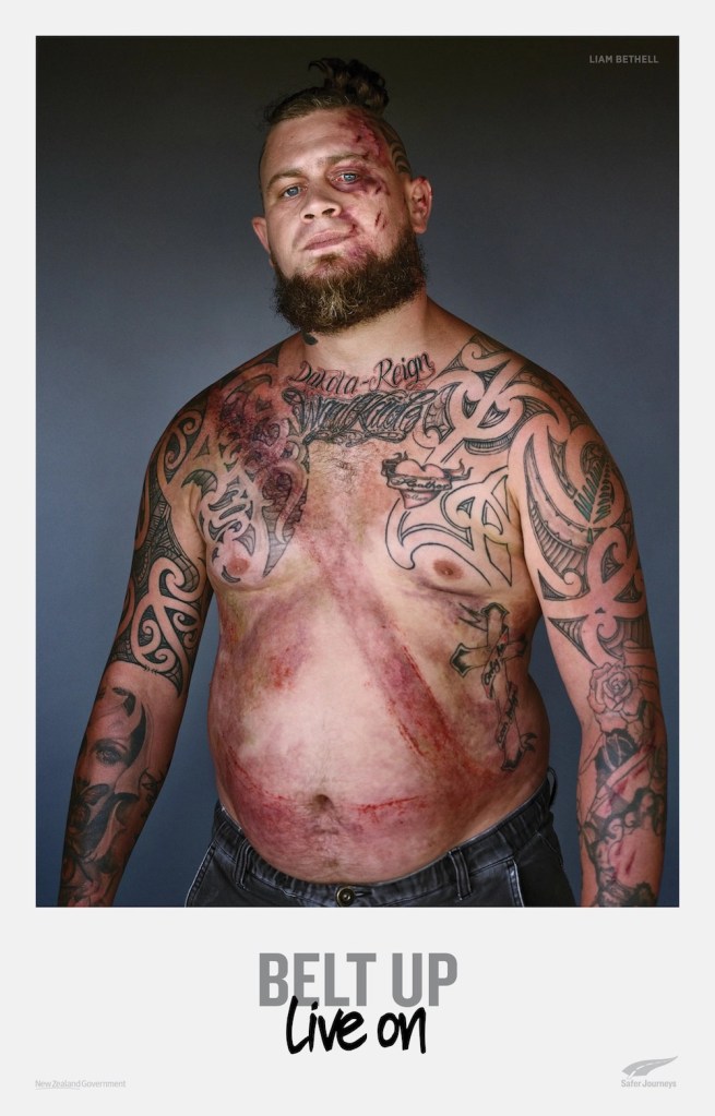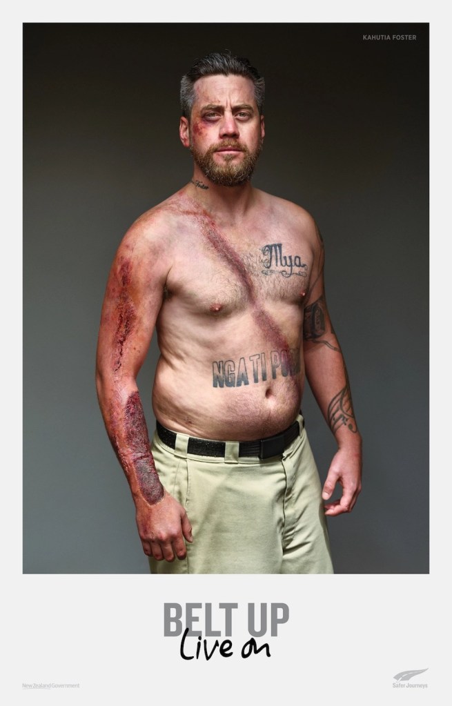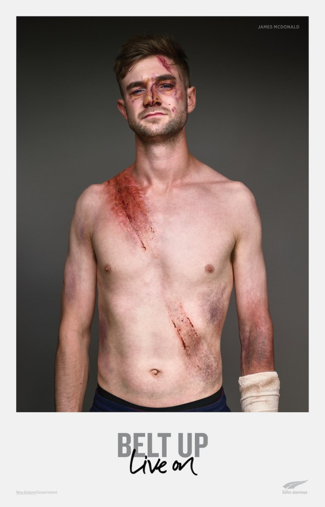 ถึงกระนั้น นิวซีแลนด์ก็ยังมีคนตายปีละ 90 คนเพราะไม่ได้ใส่เข็มขัด ทางกรมขนส่งจึงจับมือกับเอเจนซี่ชื่อดังอย่าง BDPO เพื่อสร้างแคมเปญ “Belt Up, Live On ” ขึ้นมา โดยหาอาสาสมัครชายฉกรรจ์ 10 คนที่เคยประสบอุบัติเหตุจากรถชนและรอดมาได้ จากนั้นก็เอาพวกเขาเหล่านั้นมาแต่งหน้าแต่งตาเพื่อให้สภาพกลับไปเหมือนตอนที่เพิ่งประสบอุบัติเหตุมาหมาดๆ เพื่อให้เห็นภาพชัดเจนขึ้นว่า เข็มขัดนิรภัยนั้นสำคัญแค่ไหน